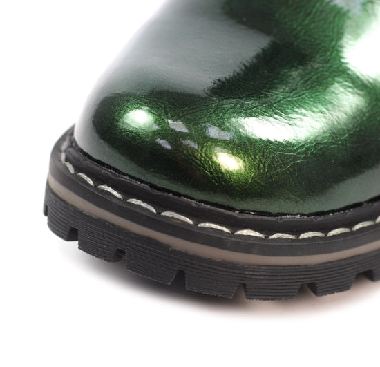 Step into the season with the trendy Parlour green ankle boot. This biker-style boot features an upper made from sleek faux patent leather, a soft textile lining, and a durable heel. The seven eyelet lace-up with side zip ensures a secure fit, while the padded insole offers all-day comfort. A decorative side buckle adds a stylish touch. Stay ahead of the trends this winter wearing the Parlour.