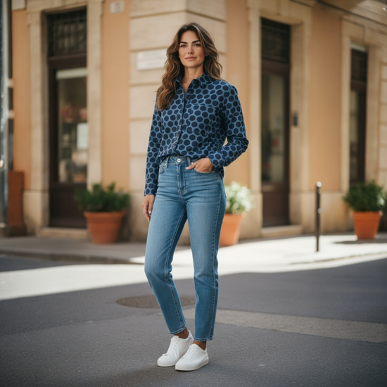 Beautiful in corduroy! This polka-dot shirt is both stylish and comfortable. It is tailored in the softest corduroy - a light, warm and ribbed fabric that feels wonderful against the skin and adds an elegant texture. The shirt has a classic cut with straight lines, a decorative chest pocket, and a slightly longer back that completes the silhouette with a feminine look. The rounded hemline adds extra finesse. Wear the shirt with jeans, black trousers or a patterned skirt - it's easy to style and suitable for both everyday wear and special occasions.