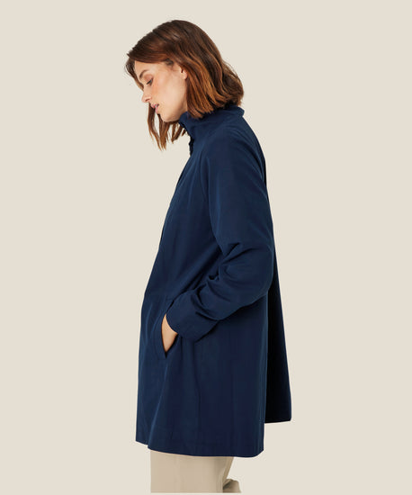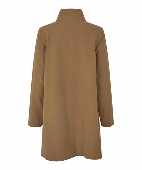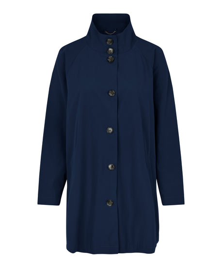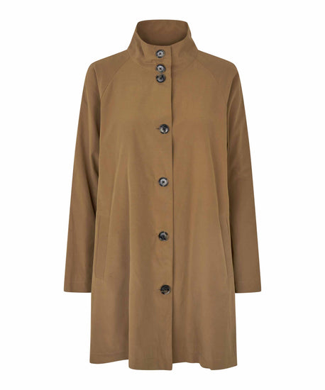 Looking for a simple, elegant and stylish coat? Then this coat is a must. The A-shaped gives the coat a feminine shape, and it is designed with a high collar, so you can button it right up to the neck on chilly days. It also has a lovely lining, which you can show off when you roll up the sleeves.